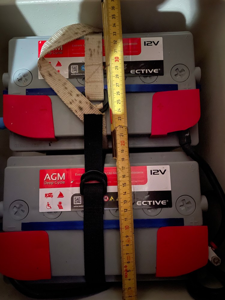 Noch auf der Liste stehen neue Batterien. Die alten (2×80 Ah von 2018) sind zwar noch ganz ok, aber die werden jetzt gegen 2x100Ah ersetzt. Mehr passt dann auch nicht in die Batteriebox unter der Salonbank rein. Das sollte aber dann auch reichen. Der geschätzte tägliche Stromverbrauch liegt bei 100Ah, wenn man 24-Std. durchsegelt und der Autopilot ordentlich mitläuft.